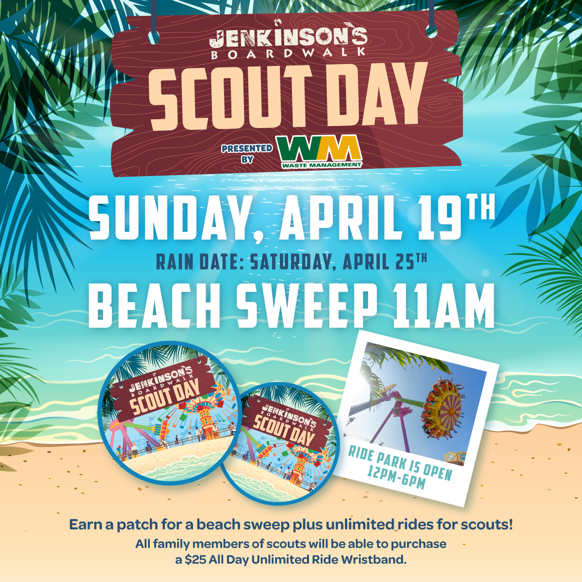 Scout Day presented by Waste Management returns to Jenkinson’s Boardwalk on Sunday, April 19 for a day of service and fun in Point Pleasant Beach. Scouts are invited to participate in a beach sweep at 11:00am and will earn a commemorative Scout Day patch for taking part. Disposable gloves and garbage bags will be provided.
