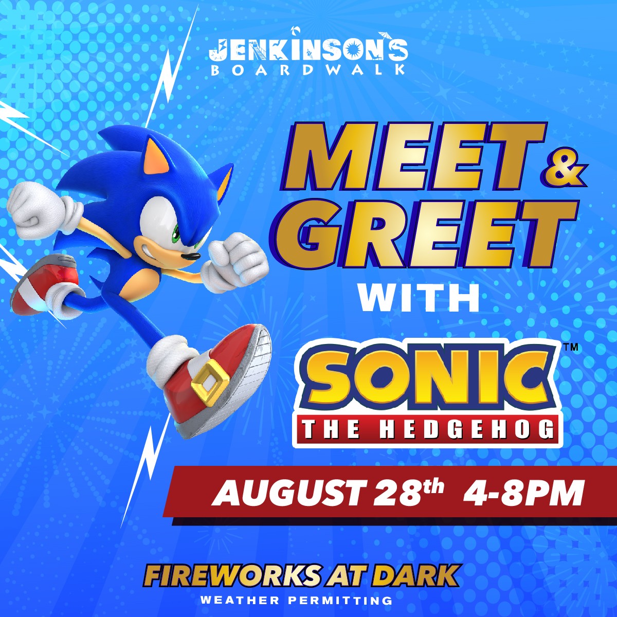 FeaturedSouth Beach Stage 500 Boardwalk, Pt. Pleasant Beach, NJ, United StatesMeet & Greet with Sonic the Hedgehog Thursday, August 28, 20254:00pm – 8:00pmSouth Beach Stage (on the beach by the rides)Fireworks at dark (weather permitting) Get ready to meet the one and only Sonic the Hedgehog at Jenkinson’s Boardwalk! Join us at the South Beach Stage, located on the beach in front of the amusement…