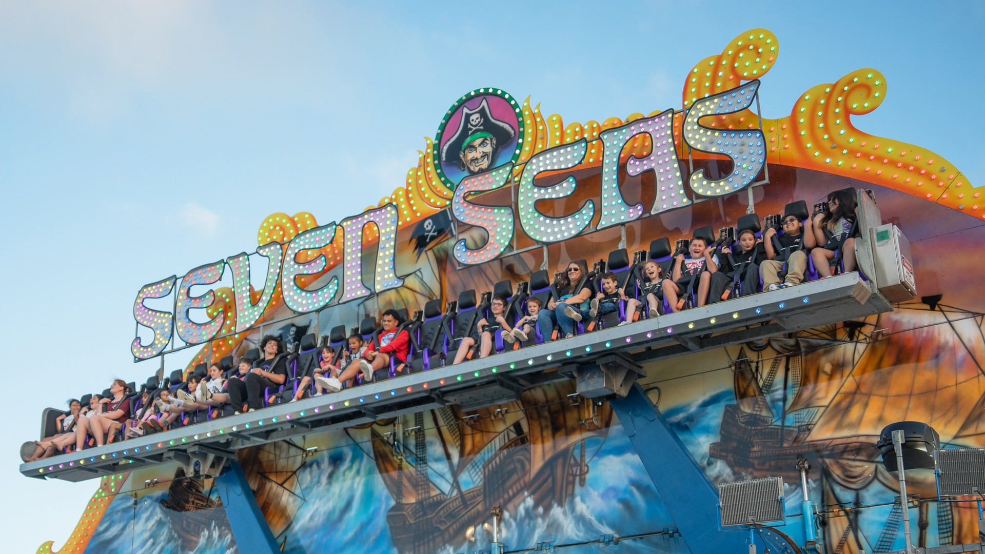 Seven Seas will have ye on the edge of yer seat! This fast-pace ride brings riders to the top and then takes them back down again in a flash.