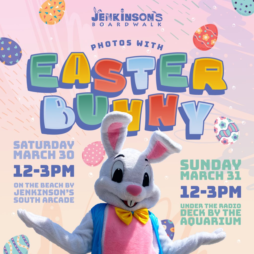 The Easter Bunny is hopping on over to Jenkinson’s Boardwalk twice this Easter Weekend! Join us for FREE photos with the Easter Bunny on Saturday, March 30th from 12:00pm to 3:00pm on the beach in front of the Jenkinson’s South Arcade by Little Mac’s and on Sunday, March 31st from 12:00pm to 3:00pm under the Radio Deck by the Aquarium!